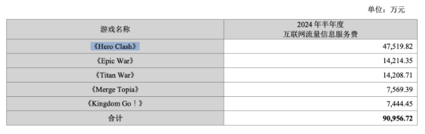 2024年上半年,仅《Hero Clash》的互联网流量信息服务费就达到4.75亿元,《Epic War》与《Titan War》次之,均为1.42亿元。