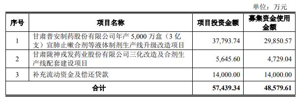 陇神戎发向特定对象发行A股股票募集说明书(申报稿)显示,本次发行预计募集资金总额不超过48,579.61万元(含本数),扣除发行费用后将全部用于甘肃普安制药股份有限公司年产5,000万盒(3亿支)宣肺止嗽合剂等液体制剂生产线升级改造项目、甘肃陇神戎发药业股份有限公司三化改造及合剂生产线配套建设项目、补充流动资金及偿还贷款。