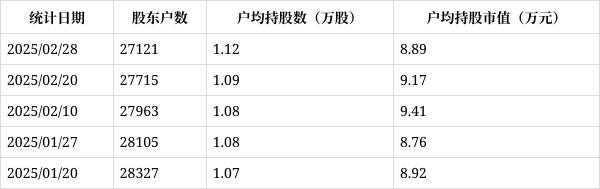从3月4日公开信息显示,陇神戎发截至2025年2月28日公司股东户数为2.71万户,较上期(2025年2月20日)减少594户,降幅为2.14%,变化不大。