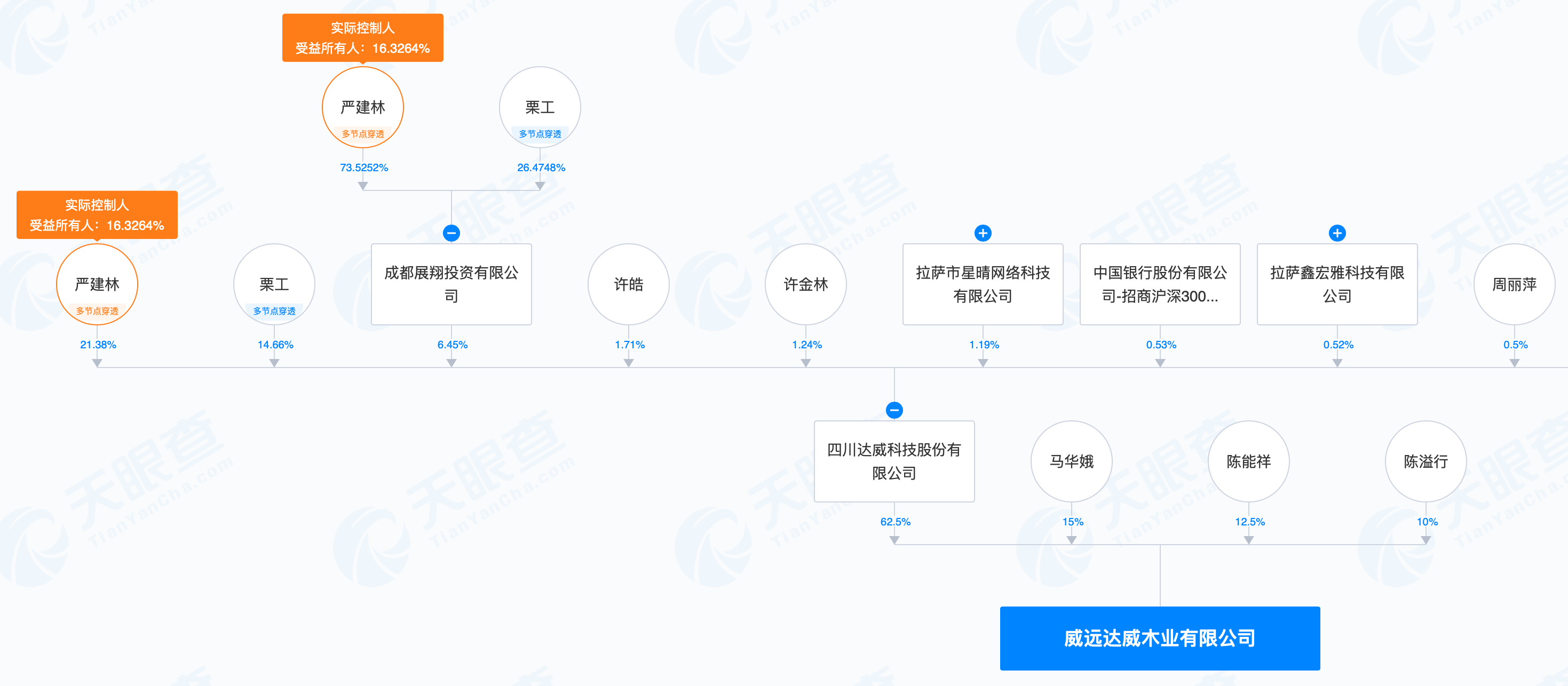转让威远达威木业股权的转让方是“四川达威科技股份有限公司”。在威远达威木业的股权架构中,达威科技持有62.5%股权,另马华娥、陈能祥、陈溢行分别持股15%、12.5%、10%。达威科技的实际控制人则是自然人严建林,最终持股21.38%。