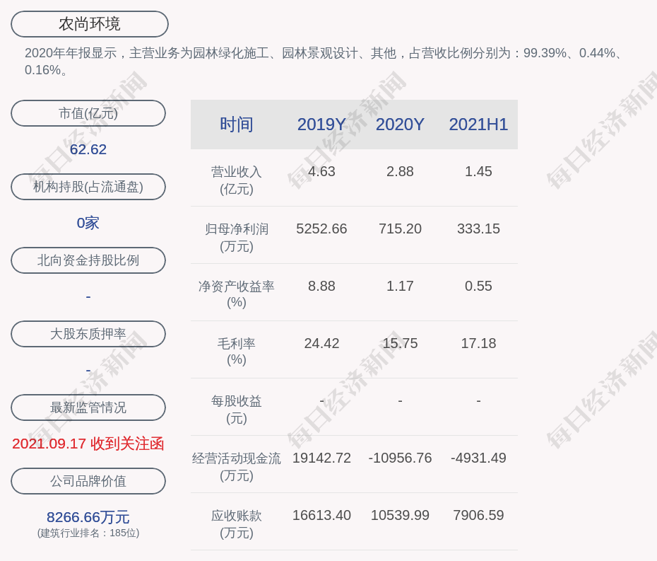 2020年年报显示,农尚环境的主营业务为园林绿化施工、园林景观设计、其他,占营收比例分别为:99.39%、0.44%、0.16%。