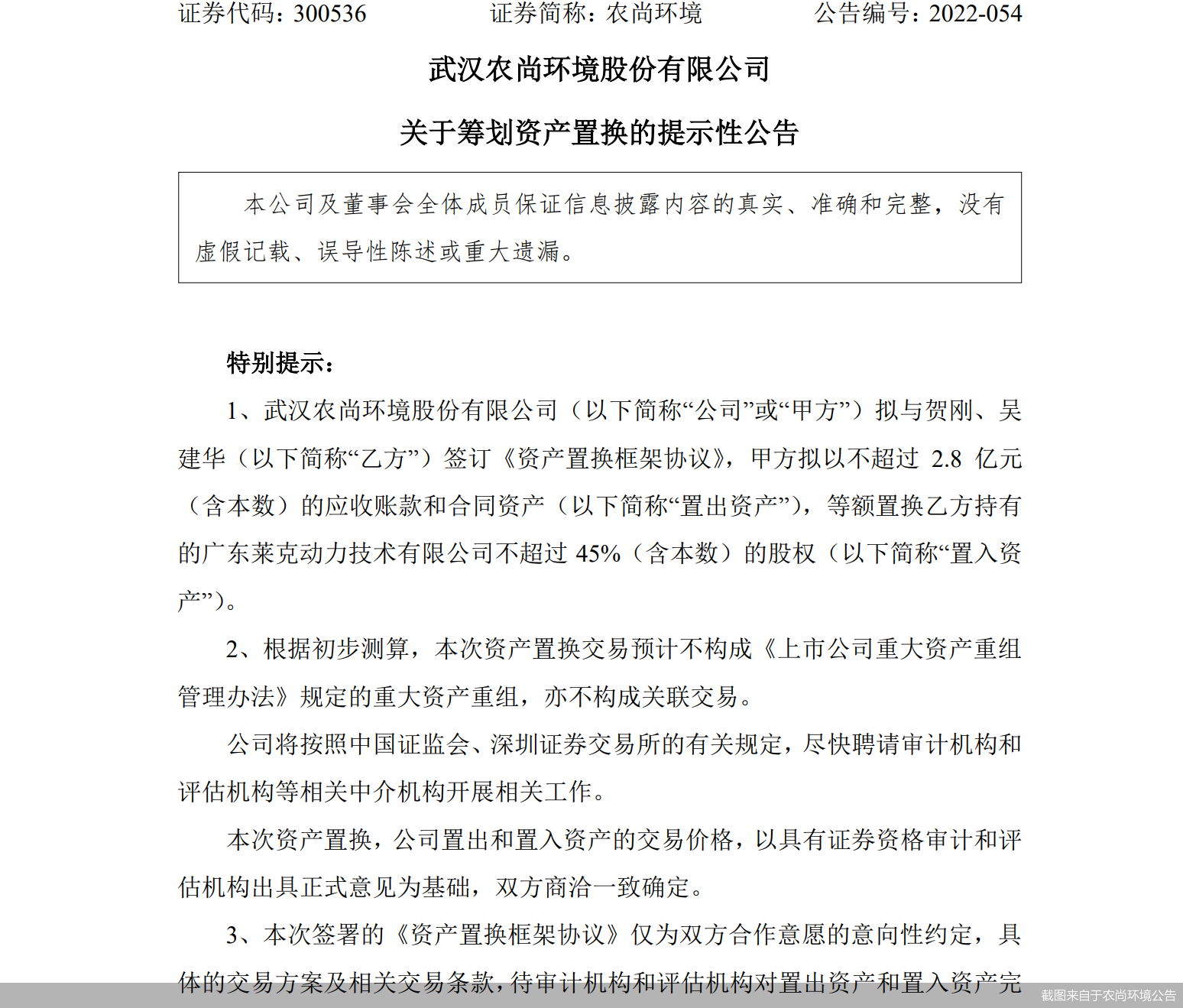 9月19日早间,农尚环境发布公告称,公司拟与贺刚、吴建华签订《资产置换框架协议》,公司拟以不超过2.8亿元(含本数)的应收账款和合同资产,等额置换贺刚、吴建华持有的莱克动力不超过45%(含本数)的股权。