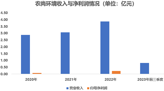 不过,受2023年地产行业低迷影响,前三季度,农尚环境实现营收8110万元,较2022年同期相比下降了73.82%;实现归母后的净利润仅有12.84万元,较2022年同期相比下降了97.46%。