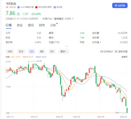 其中,*ST农尚就是面临困境的个股之一。5月10日,该股早盘低开后一路下挫,十分钟内便封上跌停板,至收盘仍未打开。若以收盘价计算,该股年跌幅已达65%。