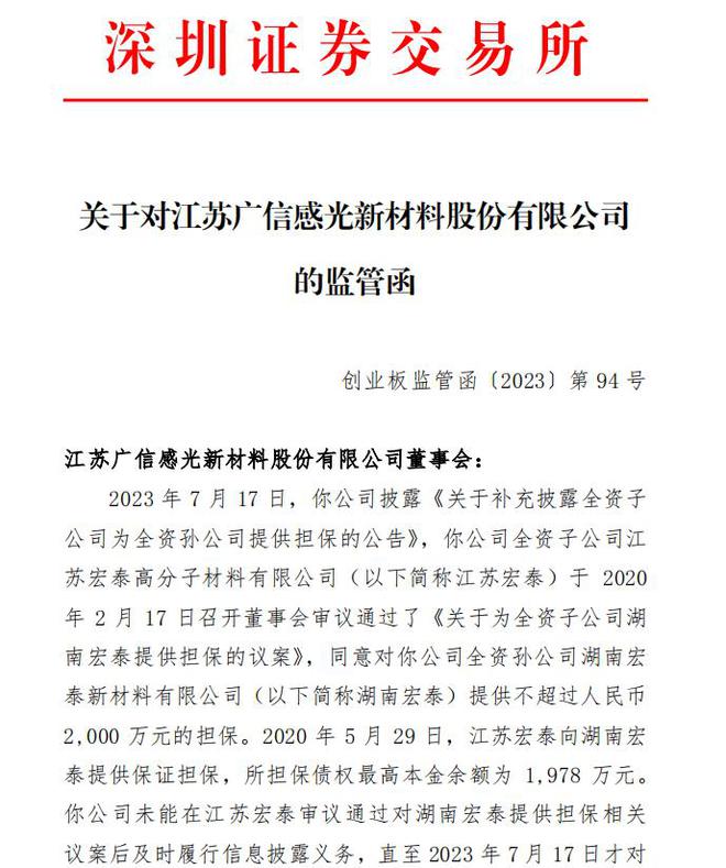 监管函显示,7月17日,广信材料披露《关于补充披露全资子公司为全资孙公司提供担保的公告》,全资子公司江苏宏泰高分子材料有限公司(下称江苏宏泰)于2020年2月17日召开董事会审议通过议案,同意对广信材料全资孙公司湖南宏泰新材料有限公司(下称湖南宏泰)提供不超过2000万元的担保。