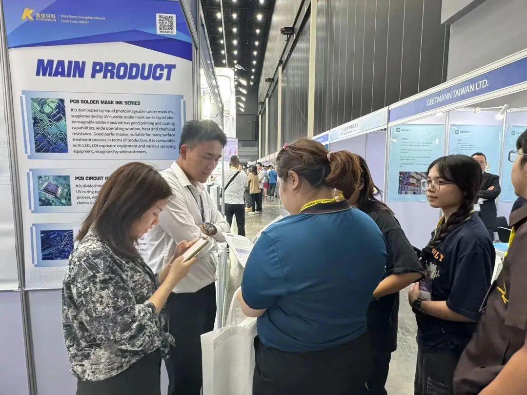 “广信材料的感光阻焊油墨系列的绿油、白油、哑黑油凭借其稳定性和通用性,在东南亚市场得到广泛认可。”广信材料展台的负责人在介绍市场成果时,指出公司通过十年的海外市场耕耘,PCB油墨业务已实现稳定增长,并与泰国多家厂商及贸易商建立了稳固的合作关系。