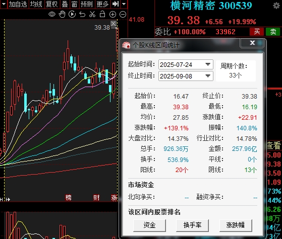 汽车零部件龙头横河精密今日盘中强势涨停,涨幅19.99%,截至14时06分报39.38元,涨幅19.99%,成交额达8.20亿元,换手率12.71%。值得注意的是,横河精密自7月24日以来,33个交易日大涨139.1%。