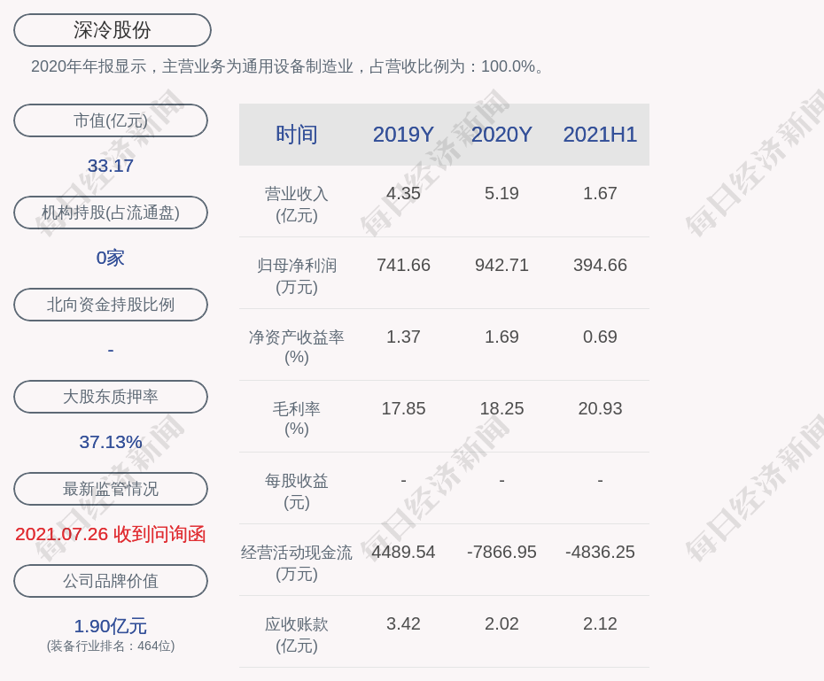 2020年年报显示,深冷股份的主营业务为通用设备制造业,占营收比例为:100.0%。
