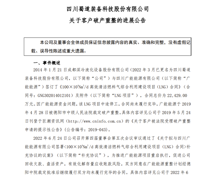 11月15日晚间,蜀道装备(300540)发布公告称,2014年1月公司与四川广能能源有限公司签订LNG合同,合同总价2.24亿元。因广能能源资金问题,该LNG项目中途停工,合同尚未履行完毕,广能能源于2019年4月被德阳市中级法院裁定破产重整。近日,德阳市中级法院已出具民事裁定书批准了广能能源的重整计划,公司与广能能源签订的补充协议正式生效,项目将按照原合同及相关补充协议约定继续履行。项目重启有利于促进公司回收欠款、盘活资产,预计将对公司财务状况产生积极影响。