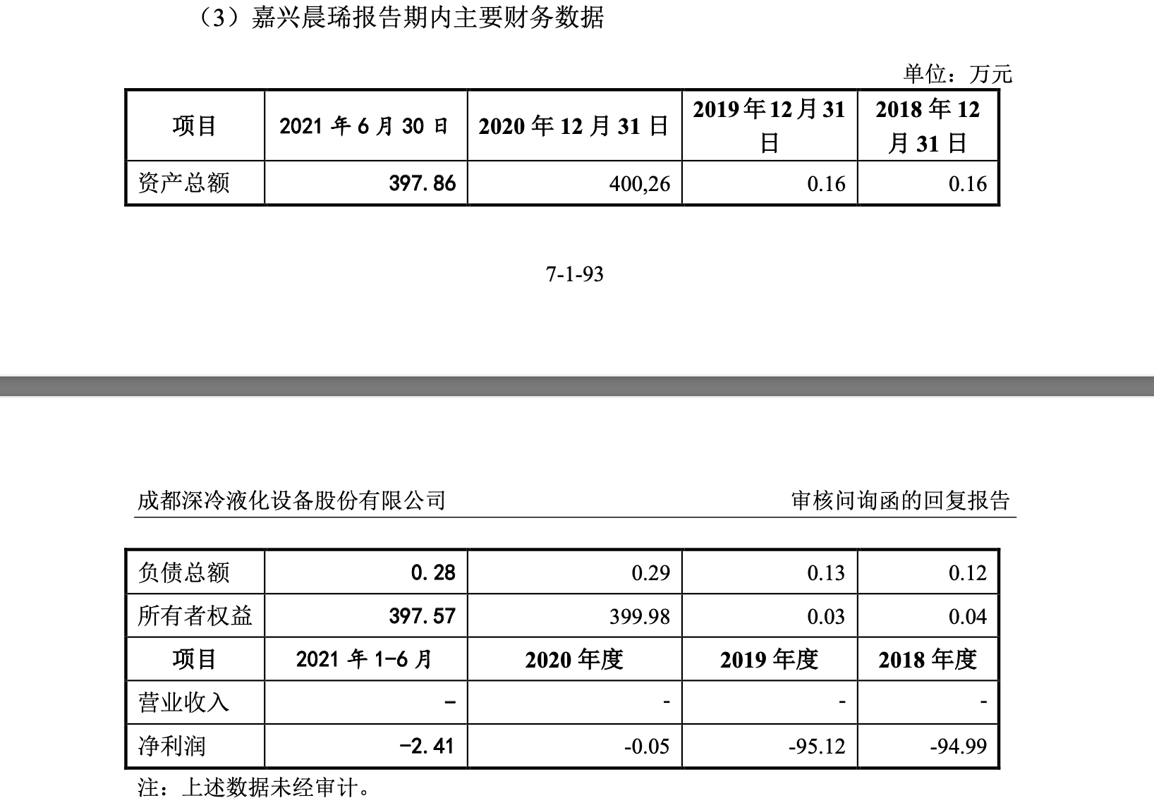从晨琋睿智的财务状况来看,根据蜀道装备此前披露,2020年末,晨琋睿智的总资产为400.26万元,所有者权益为399.98万元。