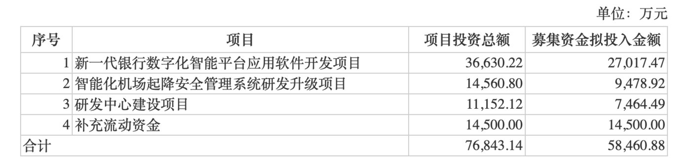 本次公司拟向特定对象发行股票募集资金总额不超过5.85亿元,扣除发行费用后实际募集资金净额将用于新一代银行数字化智能平台项目、智能化机场起降安全管理系统研发升级项目、研发中心建设项目及补充流动资金。