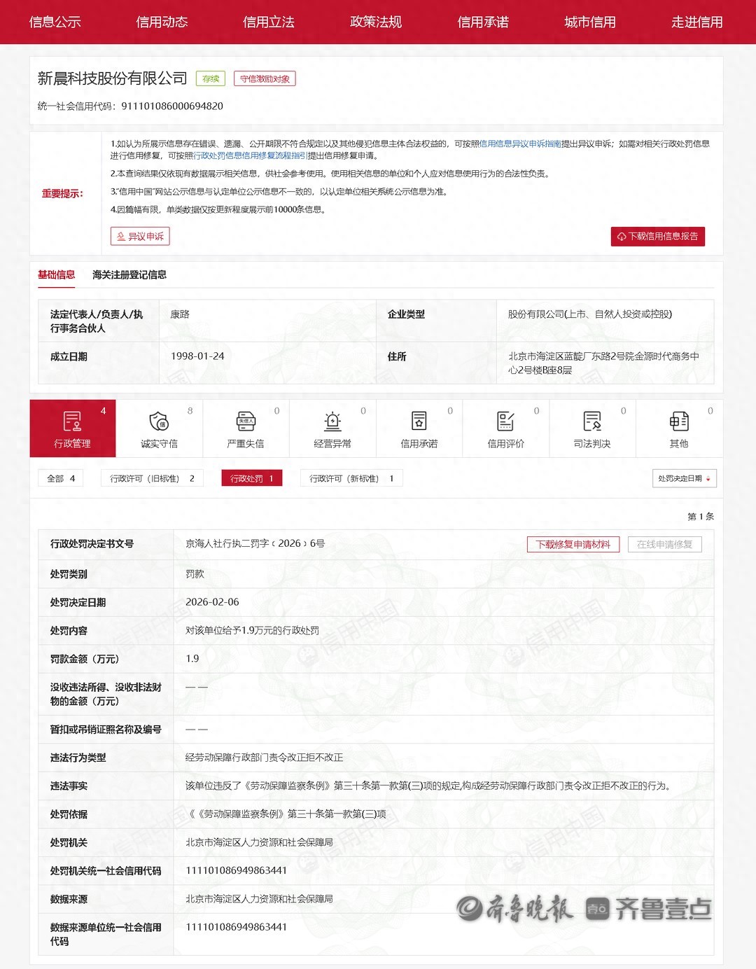 从信用中国获悉,新晨科技股份有限公司(新晨科技 300542)因违反了《劳动保障监察条例》第三十条第一款第(三)项的规定,构成经劳动保障行政部门责令改正拒不改正的行为。被北京市海淀区人力资源和社会保障局罚款1.9万元。