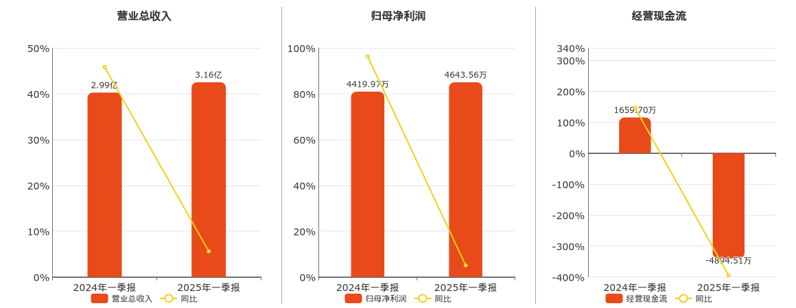 公司营业总收入为3.16亿元。归母净利润为4643.56万元。经营活动现金净流入为-4894.51万元,较去年同报告期经营活动现金净流入减少6554.22万元,同比较去年同期下降394.90%。