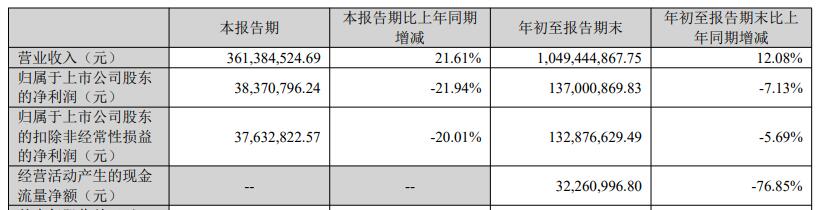 2025年前三季度,公司实现营业总收入10.49亿元,同比增长12.08%;归母净利润1.37亿元,同比下降7.13%;扣非净利润1.33亿元,同比下降5.69%;经营活动产生的现金流量净额为3226.1万元,同比下降76.85%。