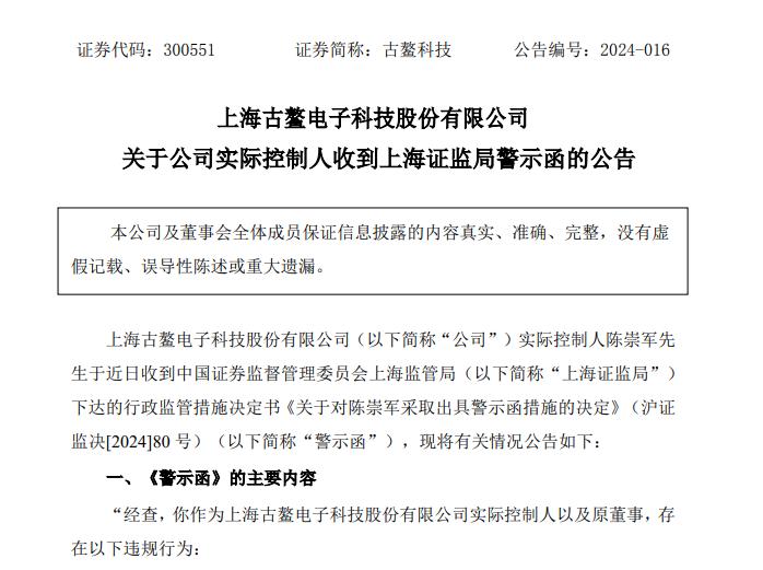 3月12日晚,古鳌科技发布公告称,实控人陈崇军于近日收到上海证监局下达的《关于对陈崇军采取出具警示函措施的决定》。