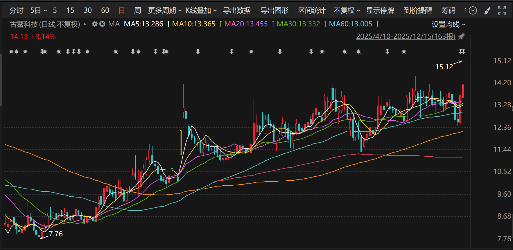 12月15日, 古鳌科技 股价高位震荡,截至收盘,收涨3.14%,报14.13元/股,市值48.05亿元。