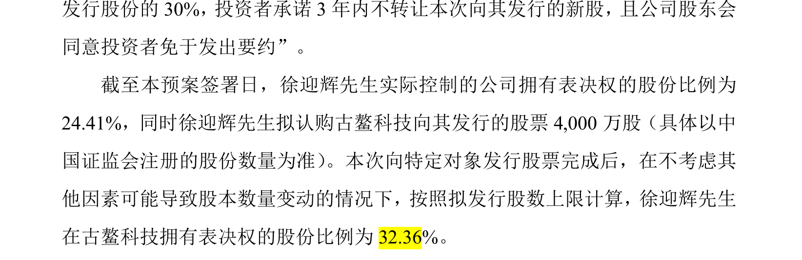 公告显示,本次向特定对象发行股票完成后,在不考虑其他因素可能导致股本数量变动的情况下,按照拟发行股数上限计算,徐迎辉在 古鳌科技 拥有表决权的股份比例为32.36%。
