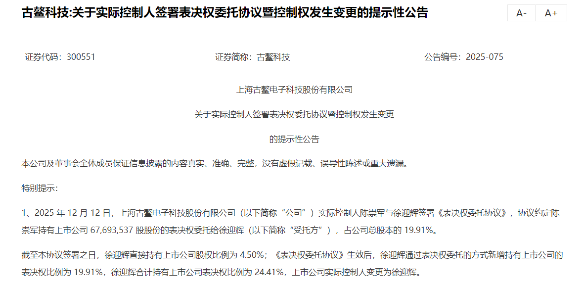 12月14日, 古鳌科技 公告称,公司实控人陈崇军将所持6769.35万股股份的表决权委托给徐迎辉行使。上述协议生效后,徐迎辉所持公司表决权比例达到24.41%。公司实控人变更为徐迎辉,股票自12月15日开市起复牌。