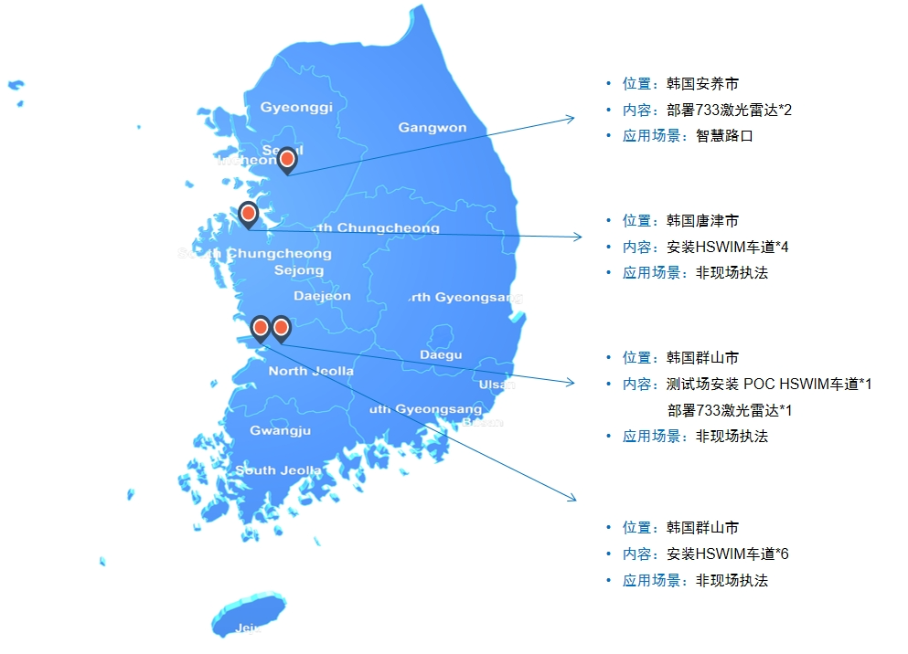本项目部署于韩国唐津市和群山市的高速公路站点,面向本地超限治理需求,采用万集自主研发的动态称重系统,覆盖双向共10条车道,现已完成系统建设并投入使用,为当地超限治理提供稳定、高效的技术支撑。