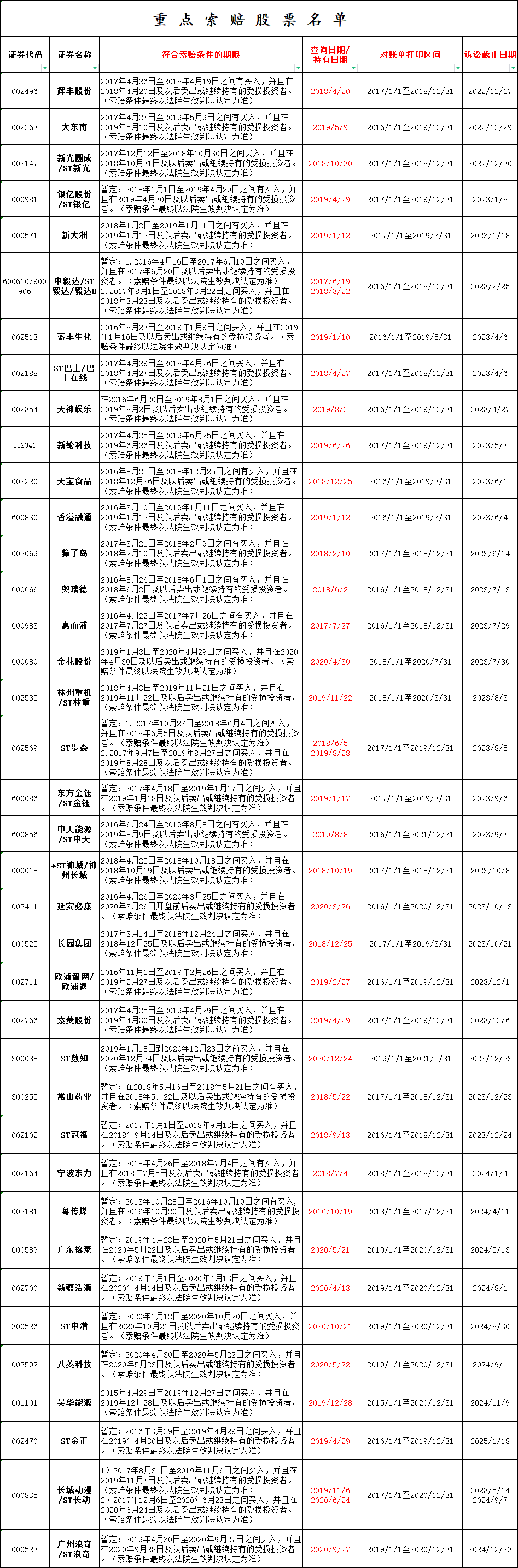 附:重点索赔股票清单