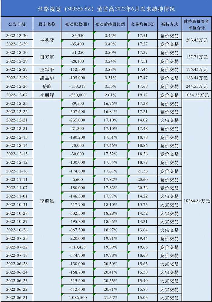 2022年6月,丝路视觉公告披露,公司大股东、董事长、总裁李萌迪拟自公告之日起三个月内合计减持公司股份不超过305.88万股(占公司总股本比例2.56%)。同批次宣布减持的还有董事、副总裁李朋辉,董事、副总裁王秀琴,董事胡晶华,副总裁、财务总监康玉路,副总裁岳峰,副总裁田万军,董事会秘书王军平。