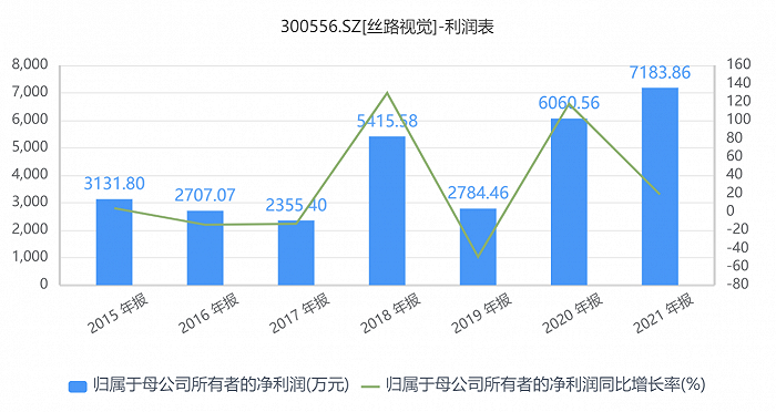 丝路视觉主要从事以CG技术为基础的数字视觉综合服务业务,公司于2016年11上市,被称为“CG行业第一股”。上市以来,公司业绩整体呈增长态势,归母净利润由2016年的2707.07万元增至2021年的7183.86万元,这期间净利润同比增长率最高为2018年的130%,最低为2019年的-49%。