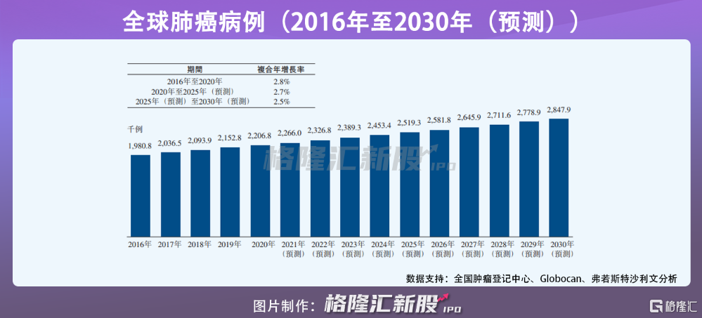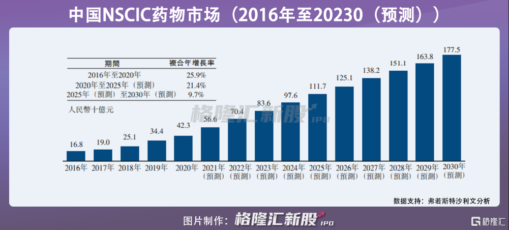以占据肺癌发病率约85%的上皮细胞肺癌——非小细胞肺癌(NSCLC)药用市场为例,自2016年至2020年,我国整体NSCLC药物市场从168亿元增至423亿元,并预计于2025年和2030年将分别达到1117亿元及1775亿元,年复合增长率为9.7%。