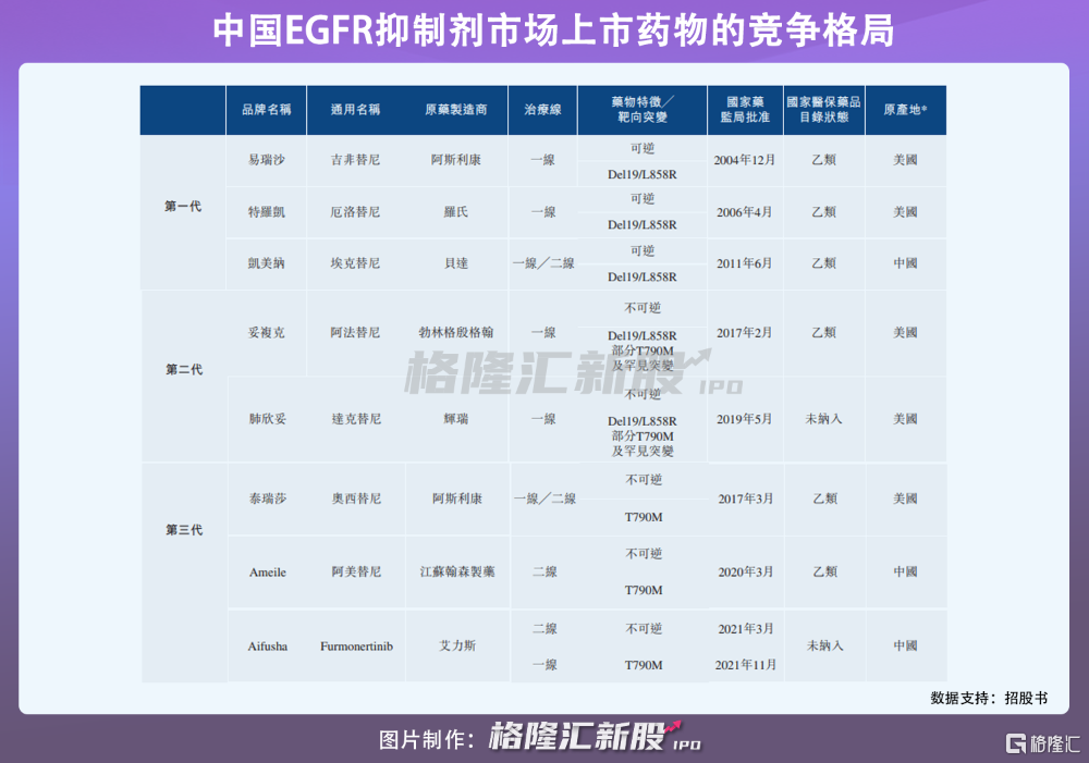 需要指出的是,EGFR靶点研发的药物分三代,埃克替尼是第一代EGFR-TKI产品。从竞争格局来看,同属于第一代EGFR-TKI药物已经有两款竞品获批上市,分别为吉非替尼、厄洛替尼。