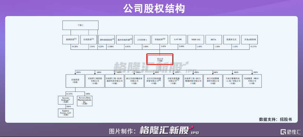 股权结构方面,截至今年11月30日,创始人之一丁博士为公司实际控制人,通过凯铭投资和贝成投资合计间接持股22.82%,另直接持股0.20%,合计共控制贝达药业23.02%的股份。