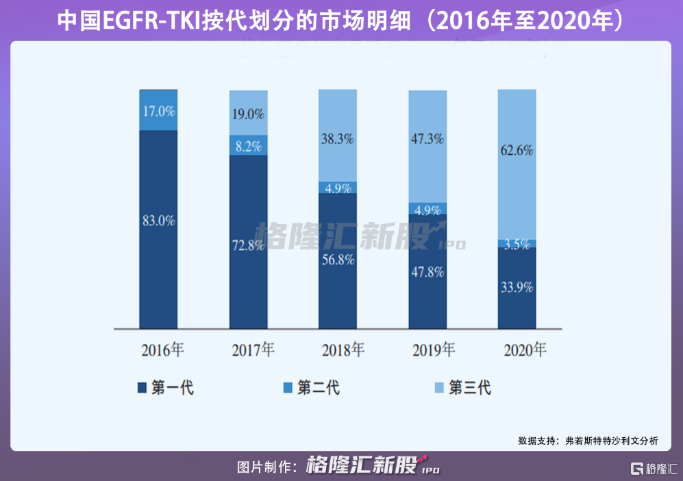 与此同时,第二代和第三代EGFR-TKI药物也均已经出炉,甚至部分进入医保。弗若斯特沙利文数据显示,自2016年到2020年,第一代EGFR-TKI产品市场份额持续下滑,从83%的下降至33.9%,而第三代产品市场从2017年的19%升至2020年的62.6%。