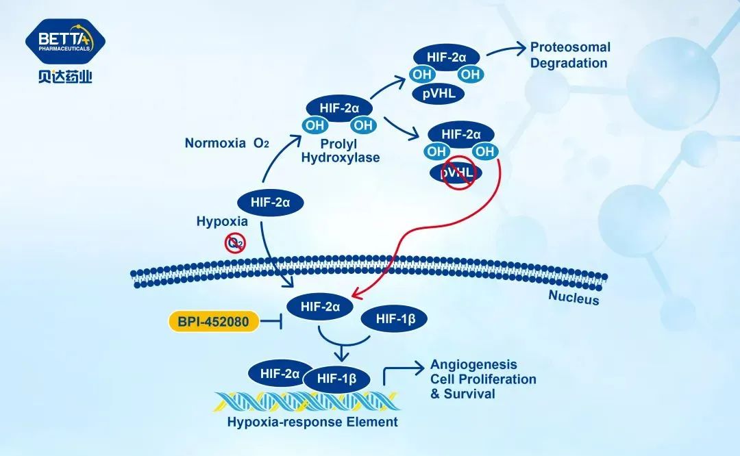 BPI-452080由贝达药业自主研发,是一种高效、特异性小分子HIF-2α抑制剂。临床前研究显示,BPI-452080能够特异性阻断HIF-2α与HIF-1β异二聚化,从而抑制下游基因的转录表达,在多种缺氧或氧感知通路异常的肿瘤细胞和动物模型上展现出优秀的体外活性和体内药效,并具有良好的药代动力学性质及安全性。