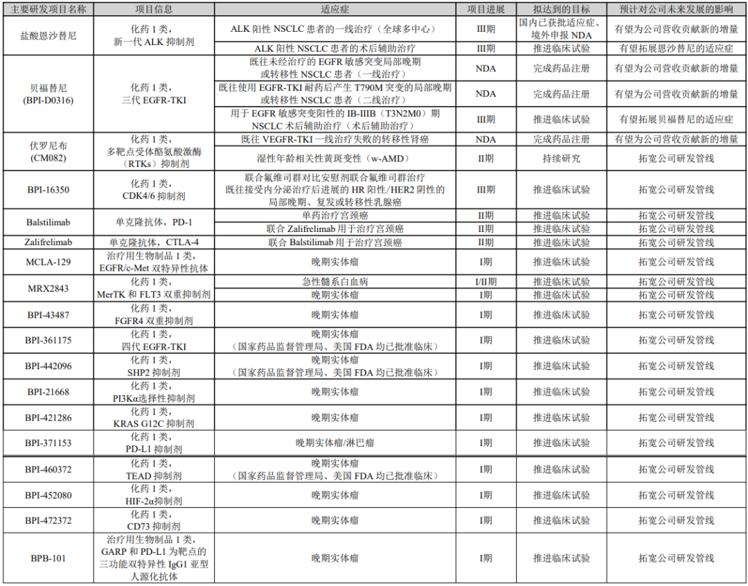除了三款已上市产品外,贝福替尼一线、二线治疗适应症及伏罗尼布肾癌适应症上市许可申请已提交审批,BPI-16350项目进入临床III期,MCLA-129、巴替利单抗(Balstilimab)、泽弗利单抗(Zalifrelimab)等40余项在研项目持续推进。