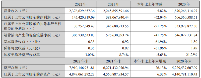 4月23日,贝达药业公布2022年年报,全年总营收23.77亿元,同比增长5.82%;净利润1.45亿元,同比减少62.04%;扣非净利润3025万元,同比减少91.25%。