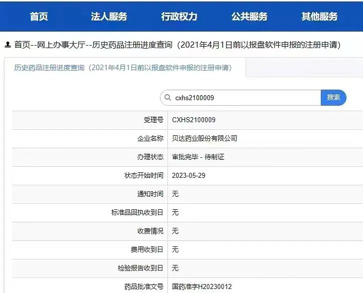 从国家局最新的药品注册进度查询可以看出,贝福替尼仍然处于正常审批的过程中,目前流程走到待制证的阶段。