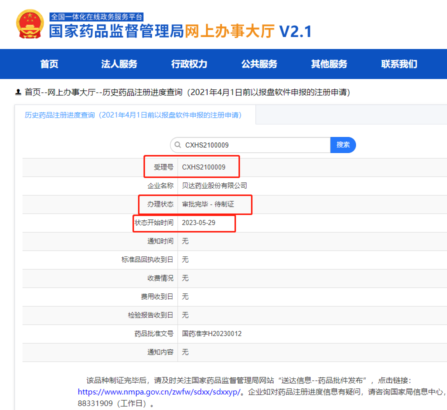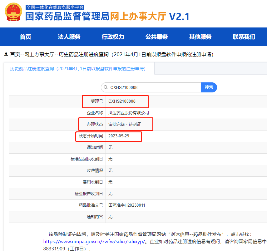 2021年3月,贝达药业曾发布公告称,贝福替尼的上市许可申请已获得国家药品监督管理局受理,受理号分别为CXHS2100008国、CXHS2100009国。从国家药品监督管理局官网查询可知,两项受理号均于5月29日进入“审批完毕-待制证”状态。