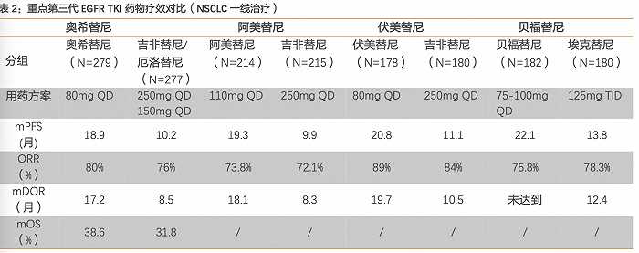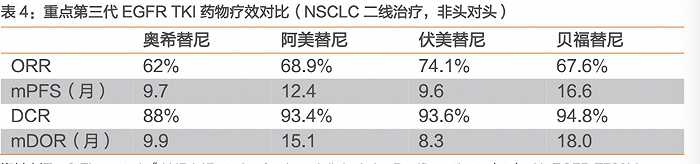 在第三代EGFR TKI的NSCLC二线治疗疗效对比中,贝福替尼也显示最长的mPFS和mDOR(非头对头)。