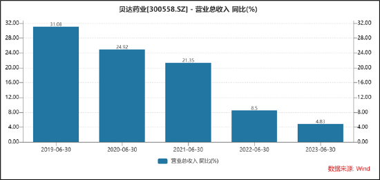从营收增速看,公司的成长性或已经在变差。从近五年中报数据表现看,贝达药业的营收增速出现持续下滑,增速由两位数跌至个位数。
