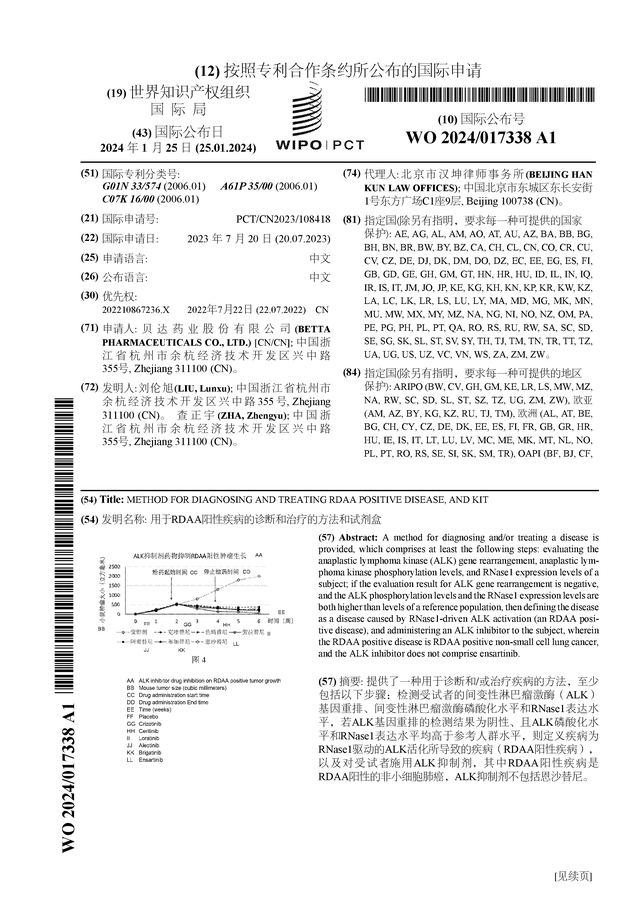 数据显示贝达药业(300558)公布了一项国际专利申请,专利名为“用于RDAA阳性疾病的诊断和治疗的方法和试剂盒”,专利申请号为PCT/CN2023/108418,国际公布日为2024年1月25日。