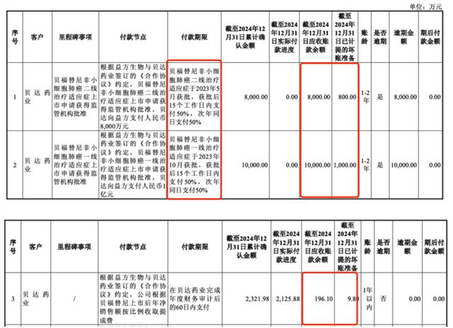 近日,益方生物在回复上交所关于2024年年报的信披监管问询函时披露,贝达药业拖欠其肺癌1类创新药贝福替尼的里程碑款项1.8亿元,逾期时间已近2年。益方生物表示,通过邮件、电话、线下拜访等方式与贝达药业多次沟通,并于2024年底发出正式催款函,但款项仍未到账。截至2024年末,益方生物已按10%的坏账率计提坏账准备1800万元。
