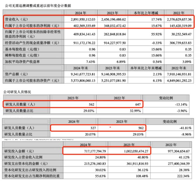 业绩方面,贝达药业2024年业绩增长背后,源于应收账款下降与成本压缩的被动支撑。2024年公司营收28.92亿元、净利润4.03亿元,同比分别增长17.74%、15.67%,其中应收账款余额同比下降65.62%,同期研发团队从2022年末的647人缩减至327人,降幅近50%;2024年研发投入下滑28.43%。与此同时,贝达药业资金链紧张的信号更为明显。2024年末公司货币资金余额4.72亿元,较年初下降37.23%;流动资产12.24亿元与流动负债18.48亿元形成倒挂,流动比率连续3年低于1,短期偿债能力堪忧,公司资金周转压力日益凸显。