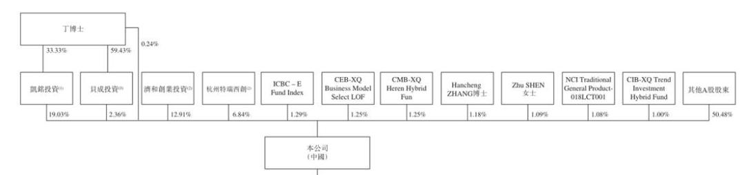 截止递表港交所,贝达药业由丁列明、凯铭投资、贝成投资分别持有0.24%、19.03%、2.36%。凯铭投资是丁列明及其子丁师哲的持股平台,贝成投资是贝达药业的员工持股平台,二者均由丁列明担任普通合伙人。因此,丁列明为贝达药业实控人,控股比例21.63%。