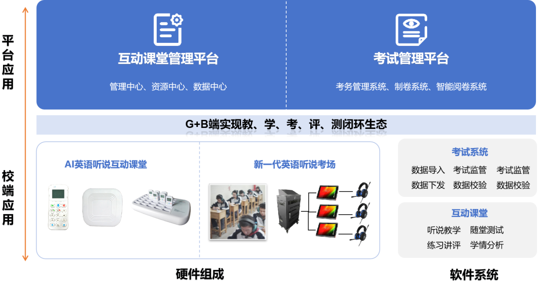在茫崖市区域建设项目中, 佳发教育 “G+B联动”的建设模式,帮助区域与学校实现了英语听说教学与考试数据的双向贯通:课堂练习数据上传至区域平台,统考数据则反哺指导学校教学优化,使“学、练、考、评”形成精准呼应的闭环。