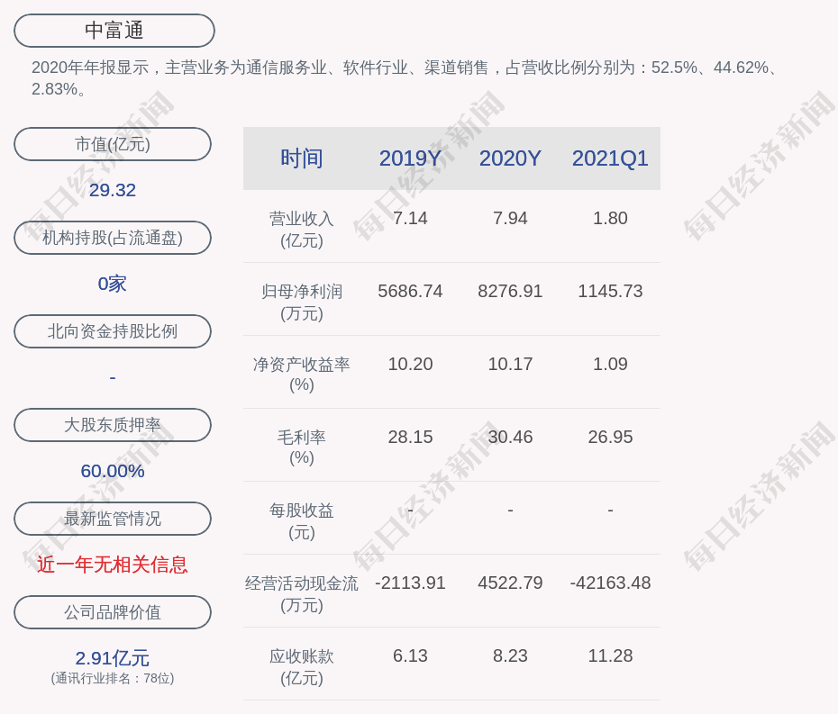 2020年年报显示,中富通的主营业务为通信服务业、软件行业、渠道销售,占营收比例分别为:52.5%、44.62%、2.83%。