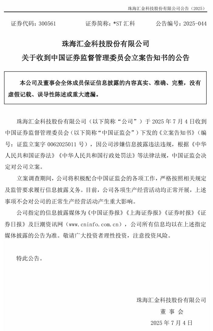 日前,*ST汇科(300561.SZ)因涉嫌信息披露违法违规被中国证监会立案。