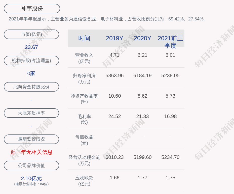 2021年半年报显示,神宇股份的主营业务为通信设备业、电子材料业,占营收比例分别为:69.42%、27.54%。