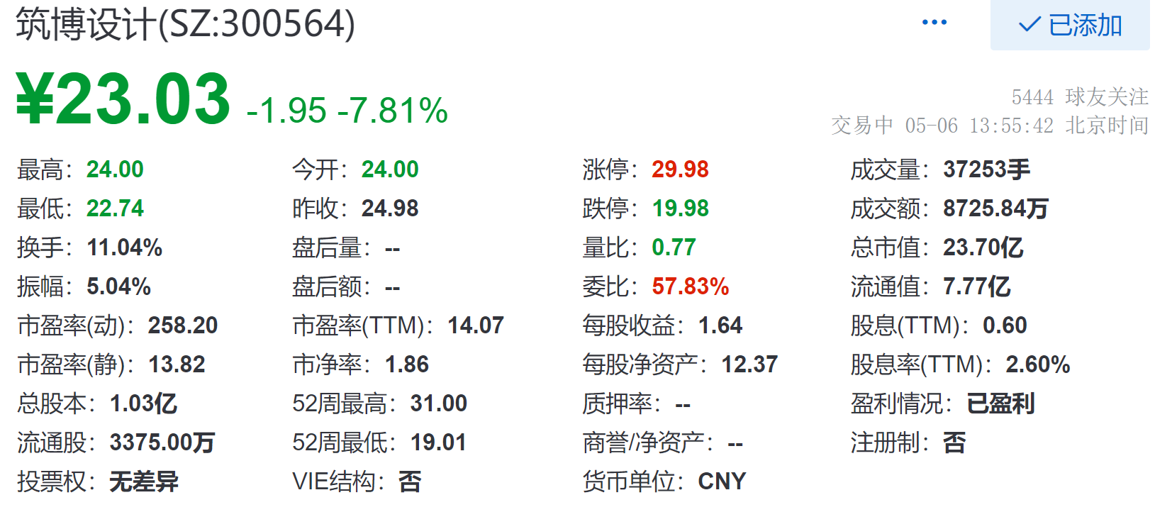5月6日,截至13:55,筑博设计(SZ:300564)下跌7.81%,现报23.03元,成交额为8725.84万元,总市值为23.7亿元。