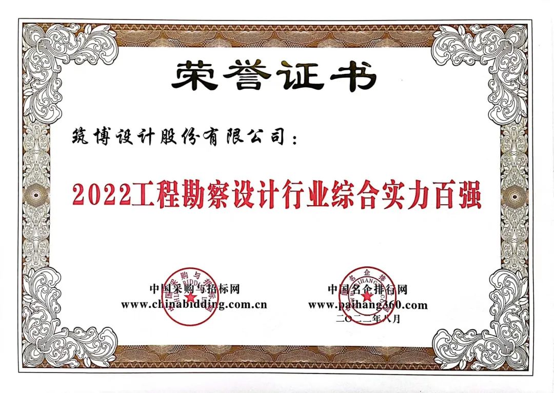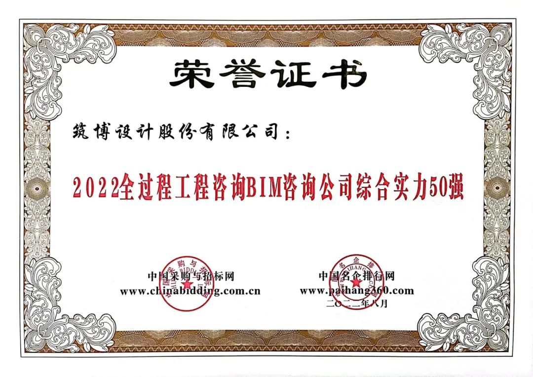 经过严格的数据核对和综合评选,筑博设计入选“2022工程勘察设计行业综合实力百强”、“2022全过程工程咨询BIM咨询公司综合实力50强”。
