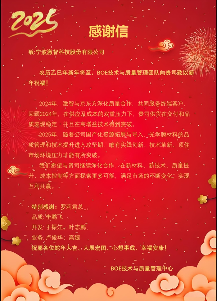 在辞旧迎新的美好时刻,激智科技收到了来自京东方技术与质量管理团队的感谢信。信中,京东方对激智科技 2024 年度的工作成果给予了高度评价,这不仅是对激智科技过去一年努力的肯定,更是双方深厚合作情谊的见证。京东方期待在 2025 年,双方能在新材料、新技术、质量提升以及成本控制等多个关键领域深化合作,共同应对市场挑战,实现互利共赢。