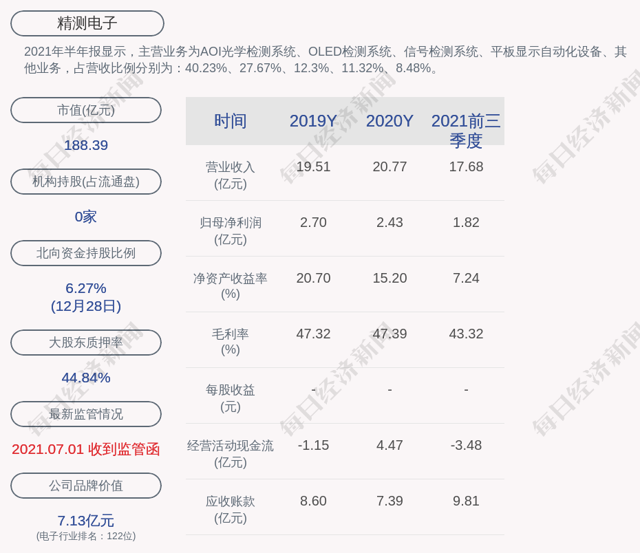 2021年半年报显示,精测电子的主营业务为AOI光学检测系统、OLED检测系统、信号检测系统、平板显示自动化设备、其他业务,占营收比例分别为:40.23%、27.67%、12.3%、11.32%、8.48%。