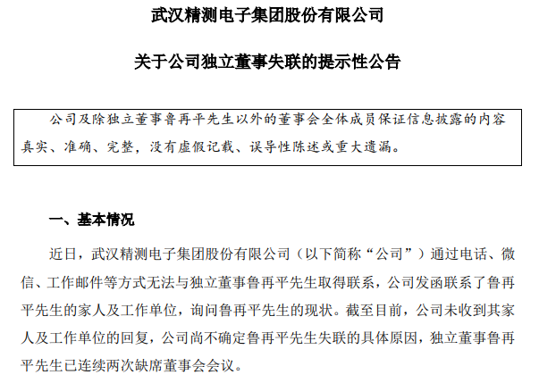 3月23日,精测电子(300567.SZ)发布公告称,无法通过电话、微信、工作邮件等方式与独立董事鲁再平取得联系,通过发函联系鲁再平的家人及工作单位,尚未得到其家人及工作单位的回复,目前尚不确定鲁再平失联的具体原因。此外,鲁再平已连续两次缺席董事会会议。